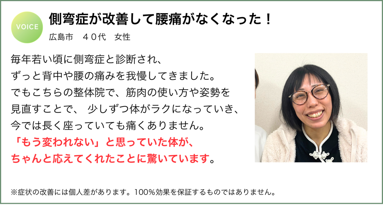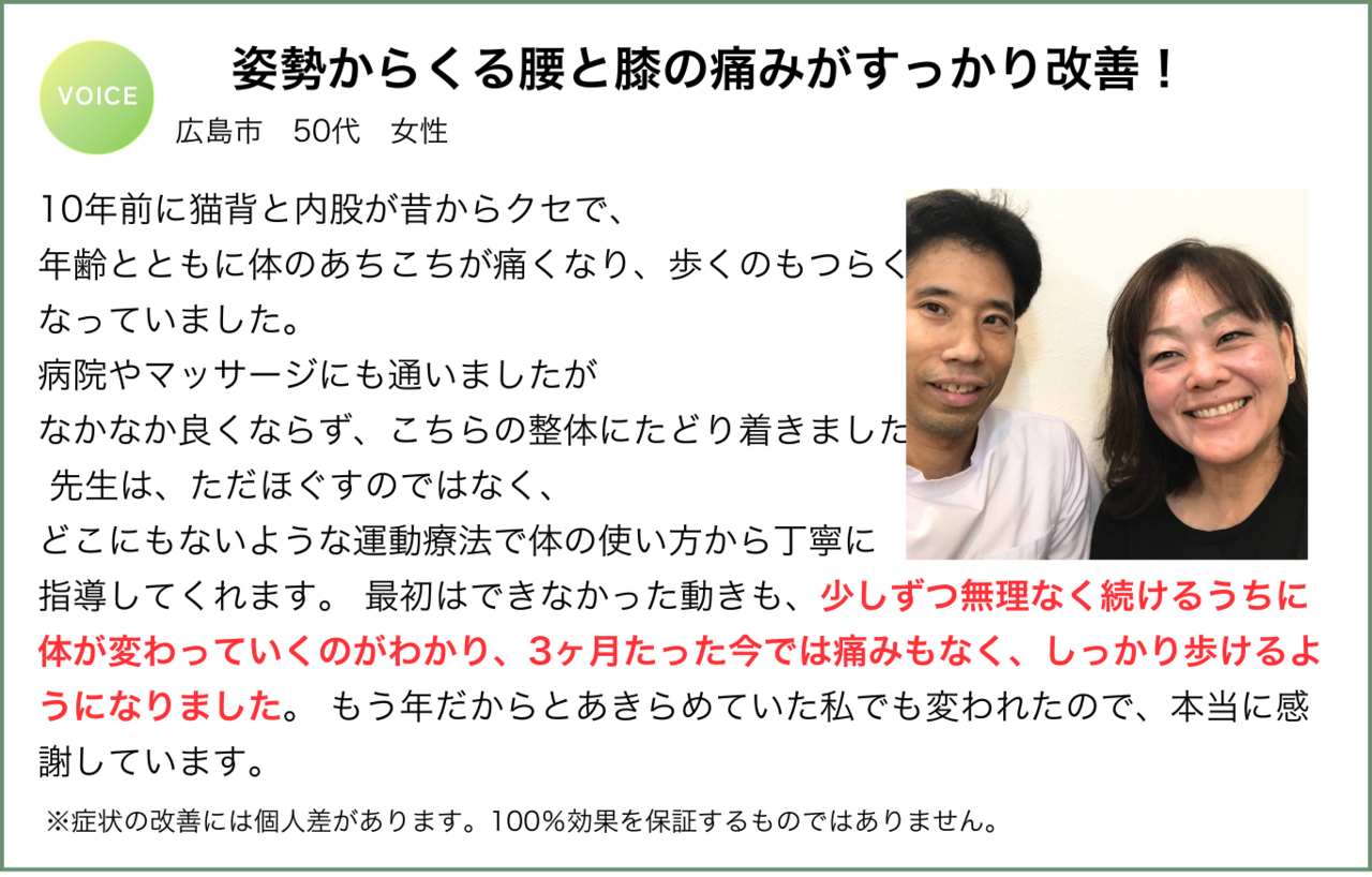 感想:まず、身近な人たちに歩き方や姿勢が正しくなったと言われて驚きました。姿勢から痛みが来ていたのかなと思うくらい痛まなくなりました。