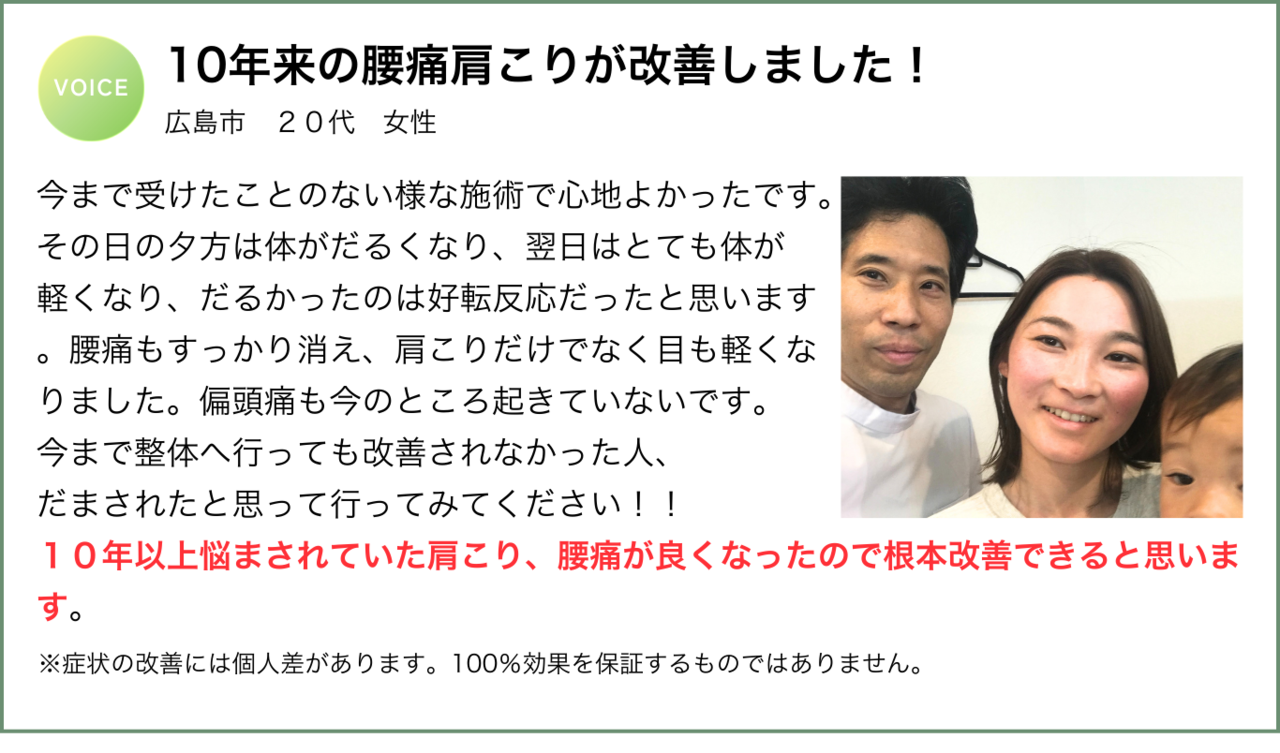 感想:施術後すぐに腰のコリが軽くなっている感じがしました。首や肩のコリも軽くなりとてもスッキリして楽になりました。2日目以降もコリが軽くなっており、あまりこらなくなった気がします。