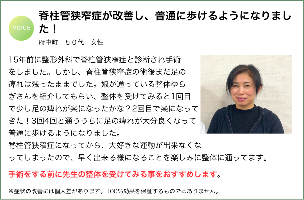 Dさん、椎間板ヘルニアを発症してから辛かったですね。施術で不眠が改善されたことはよかったです。当院の施術は症状を根本から改善していくので、徐々に体が楽になっていくことを実感していただけると思います。これからも元気な身体でいられるサポートをしますね。