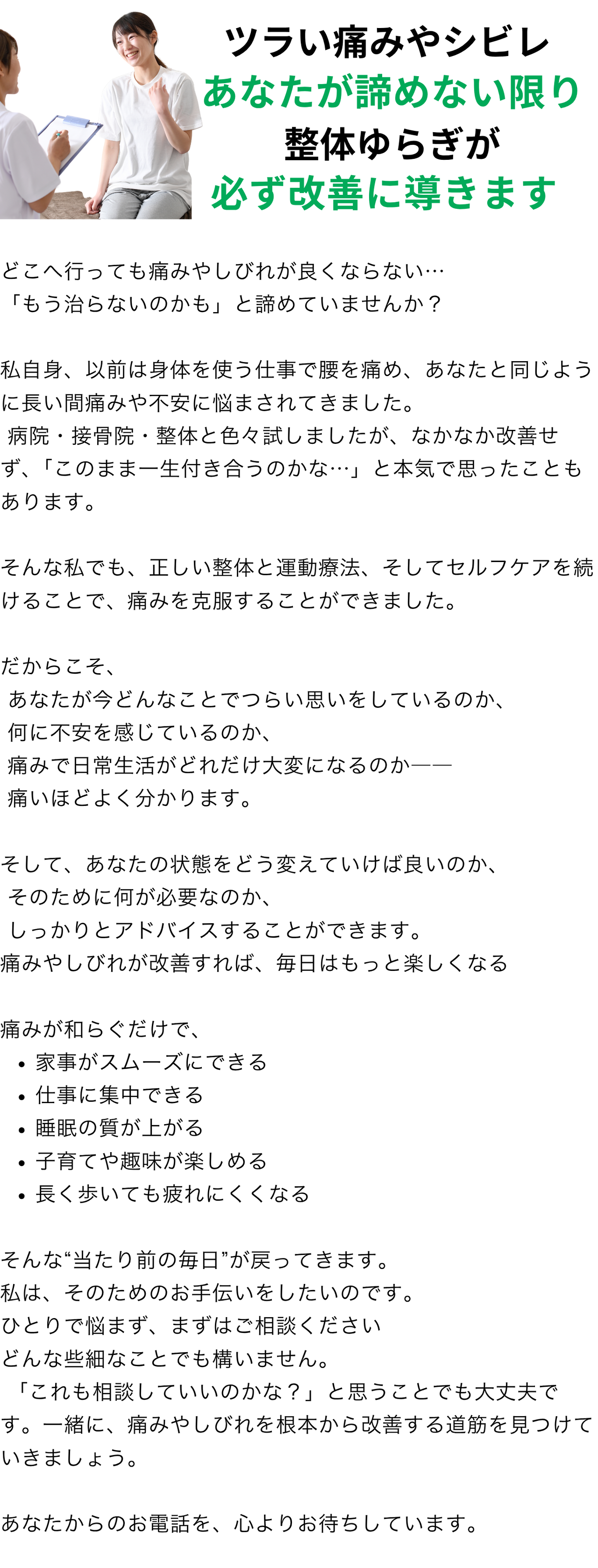 そんなあなたを、整体ゆらぎがしっかりサポートします。