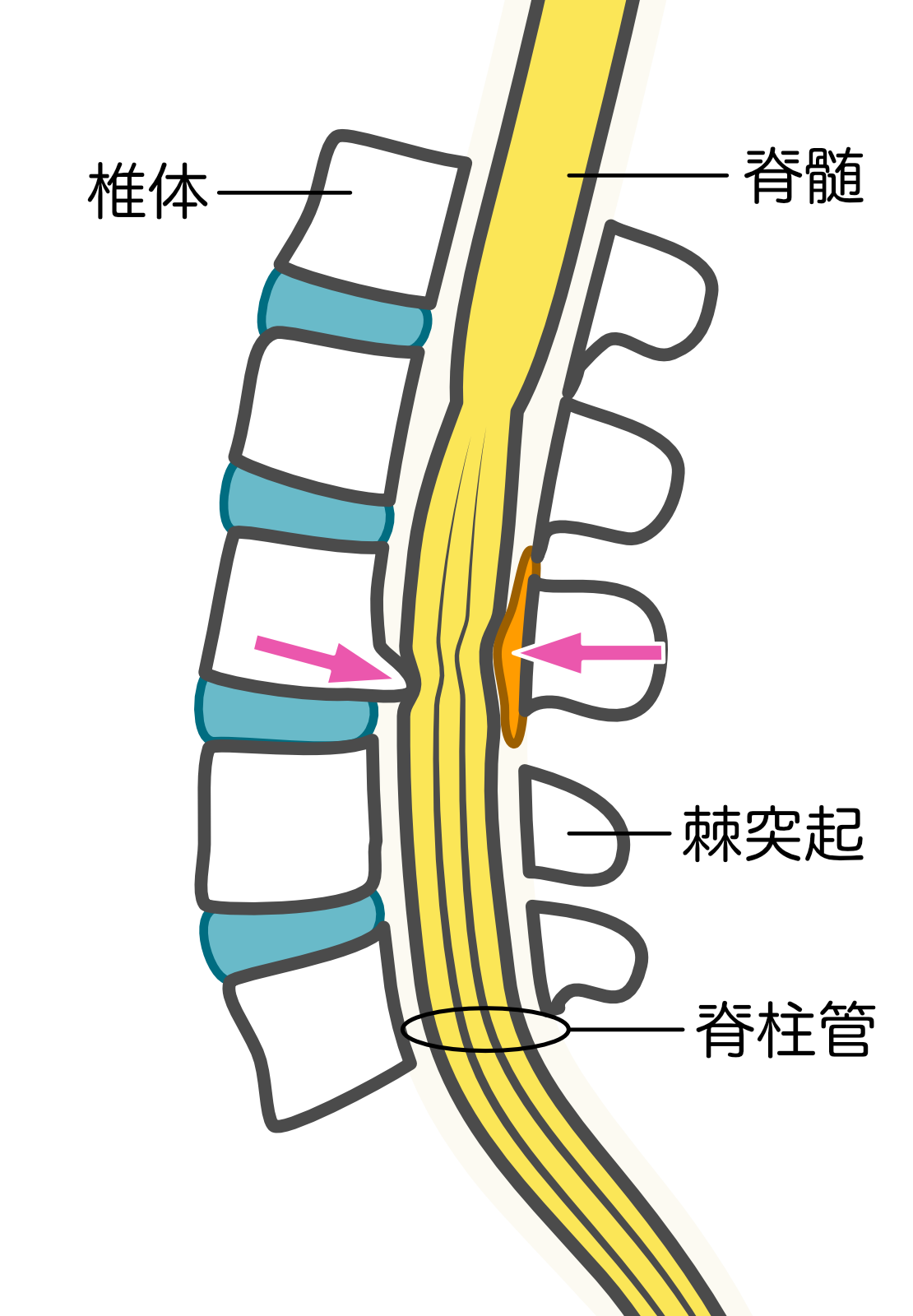 脊柱管狭窄症の原因は、加齢による筋肉の弱体化と元来の背骨の湾曲に加えて不良姿勢により背骨に大きな負荷がかかってしまい脊柱管に圧迫が生じててしまうことです。不良姿勢から生じるものとしては、骨盤の前傾や後傾と胸椎の後湾(猫背)があり、結果として、反り腰が発生してしまい、この反り腰が脊柱管狭窄の主な原因です。