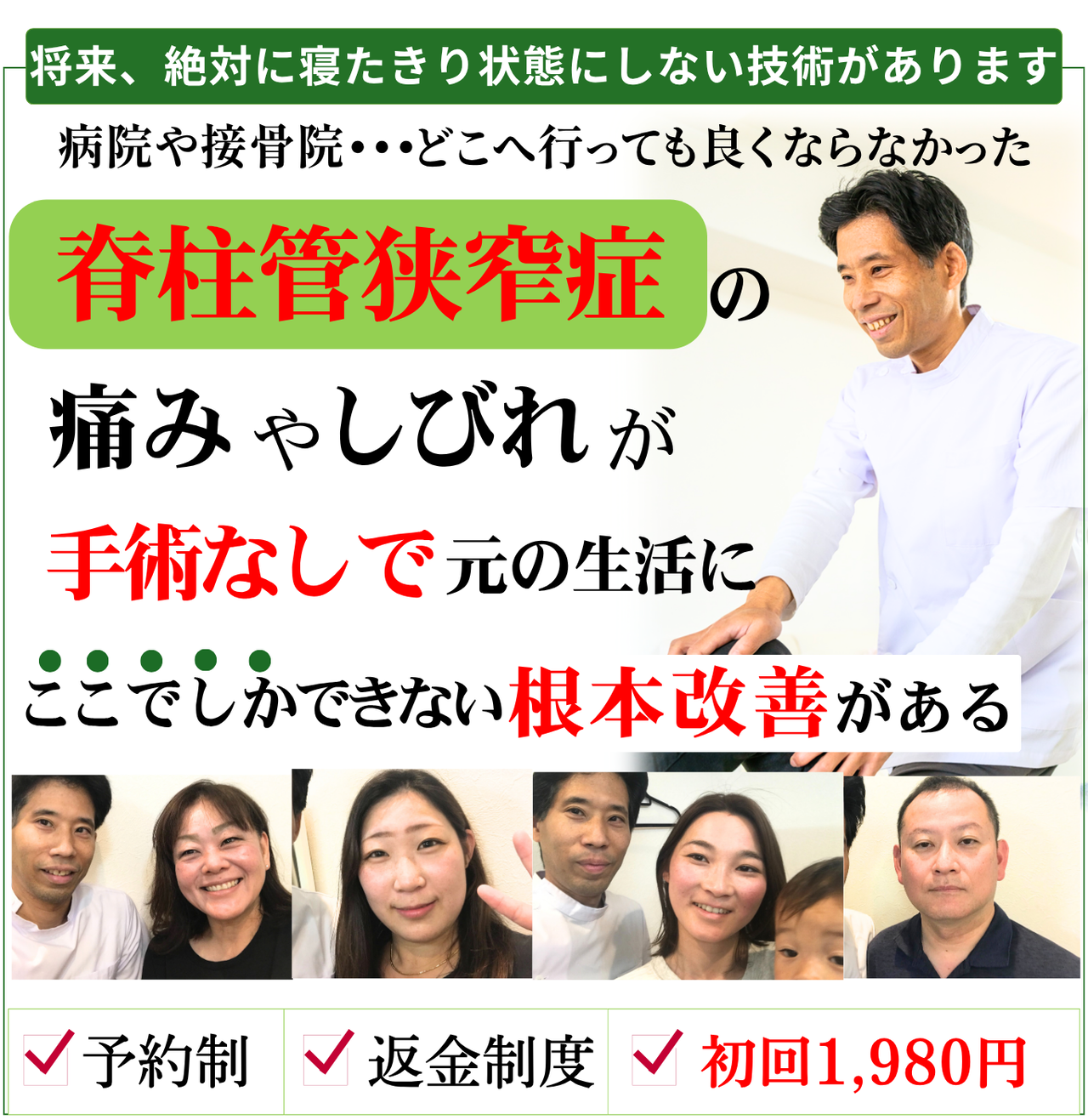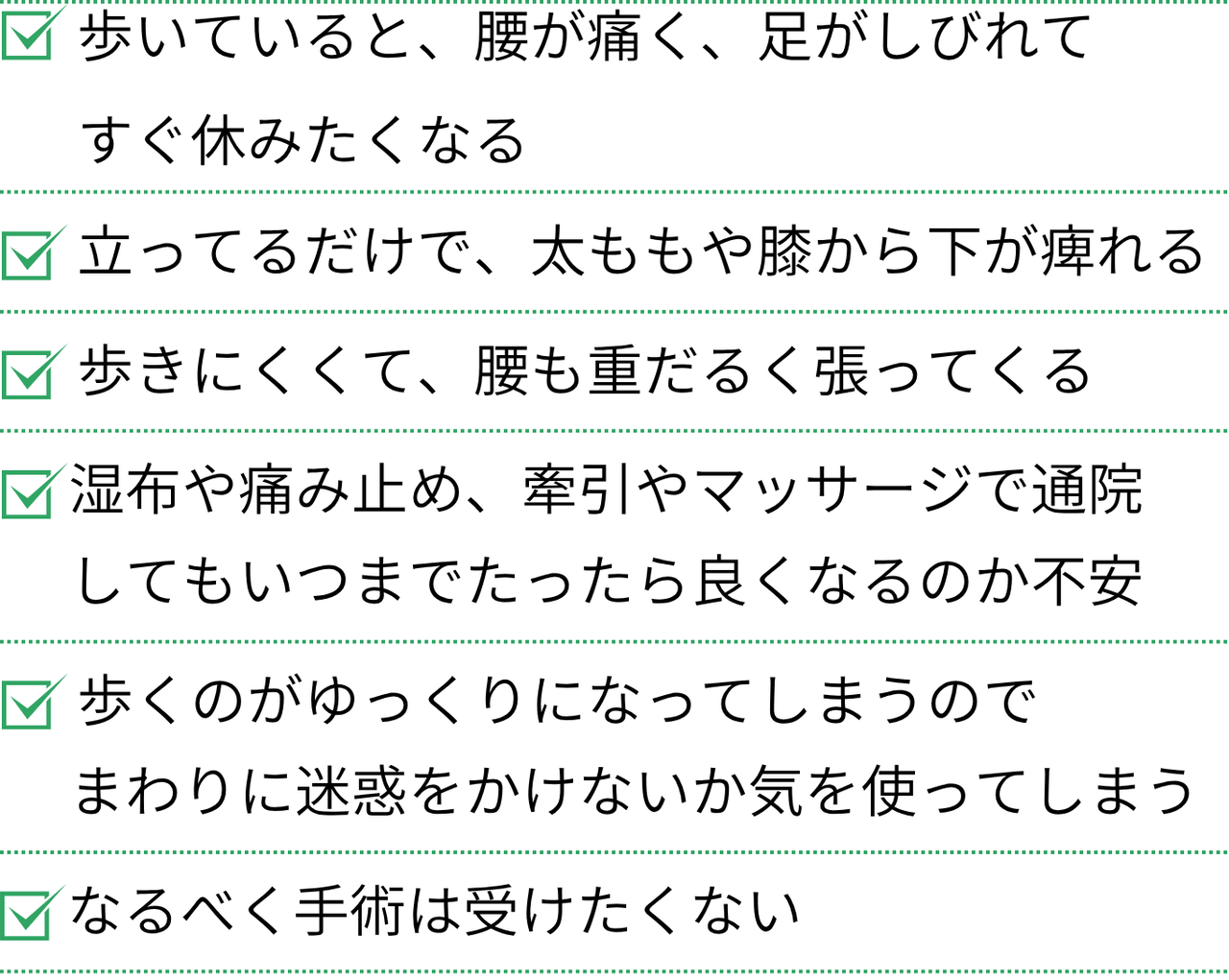 なのでこのまま放置していても悪化することはあっても改善することはありません。今以上の悪化を防ぐために、できるだけ早く対策を取った方がよいです。整体ゆらぎでは、痛みをとることはもちろん、原因である不良動作(姿勢・歩き方)の改善と筋肉の衰えにもアプローチし、根本改善をしています。あなたも、手術やブロック注射や電気治療よりも効果的と証明されている特別な運動療法を取り入れた施術で脊柱管狭窄症を根本改善して痛みやしびれのない生活を取り戻しましょう。