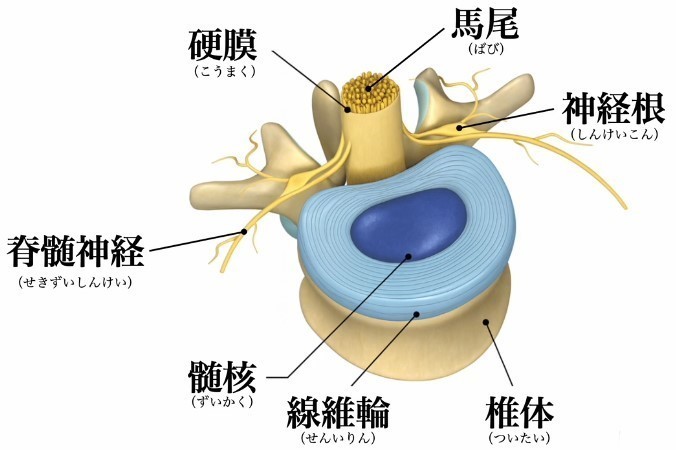 椎間板ヘルニアは、このゼリー状の部分(髄核)が外側に飛び出してしまうことで起こります。