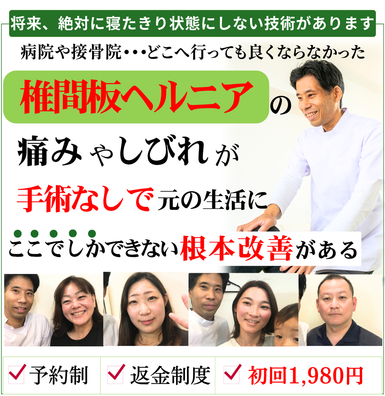 受け腰・椎間板ヘルニアの根本改善をしっかりサポートいたします。